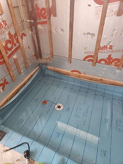 With tiling it is often hard to tell the difference between an average tile installer and a true professional, the real differences are not what you see with the finished product but what is lies underneath. The prep work for a full shower system is the most critical part and determines whether or not a shower will fail, installers who use shortcuts might be cheaper up front but will cost you thousands more down the road if you end up with a shower that leaks or worse. That's why I form my mud beds by hand with a pre slope and final slope with a pan liner in between the layers. By code a 1/4" pitch per foot is required. Once I have formed the mud bed with a pan liner and put water resistant board on the walls, I use a waterproof liquid membrane to coat the entire shower from floor to ceiling. This is a process a lot of installers skip out of laziness or just trying to be the lowest price, but it is a crucial step that is well worth it! In the pictures below are some examples of the installation of the pan liner, a finished mud bed with a 2x4 and 2x6 used to form the curb and what the liquid waterproofing membrane looks like after numerous coats have been applied.